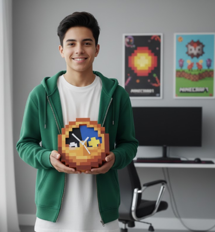 Sí, funciona perfectamente y muestra la hora con precisión, además de ser un artículo decorativo ideal para fans de Minecraft.